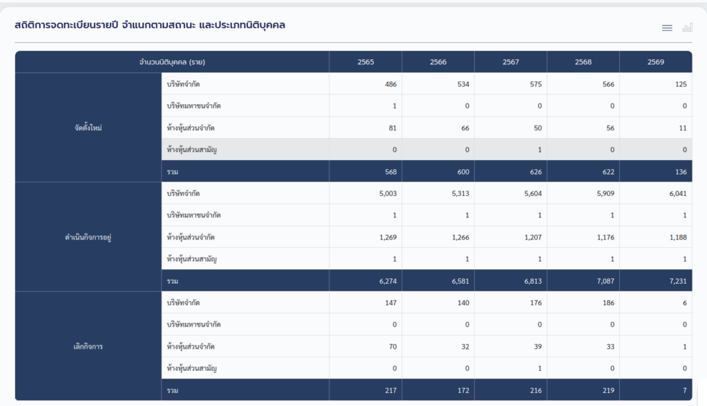 According to the Thailand Department of Business Development (DBD), as of March 31, 2026, Prachuap Khiri Khan province had a total of 7,231 legally registered business entities (juristic persons), including sole proprietorships, ordinary and limited liability partnerships and companies. This figure is 15% higher than in 2022, when there were 6,274 registered entities.