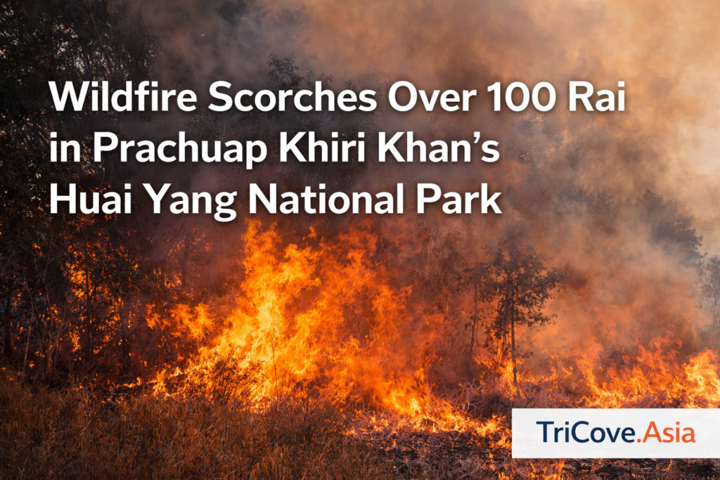 Mueang Prachuap Khiri Khan, 8 February 2026 — More than 100 rai [16 hectares] of protected forest were scorched in a fast-moving wildfire that broke out in Huai Yang Waterfall National Park (อุทยานแห่งชาติน้ำตกห้วยยาง) in Thap Sakae District (อำเภอทับสะแก). The fire, which ignited around midday, was brought under control by evening, following an hours-long effort by national park officials, wildfire units, and local volunteers.